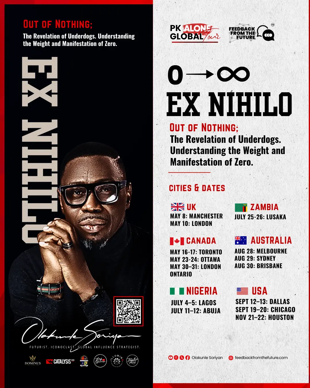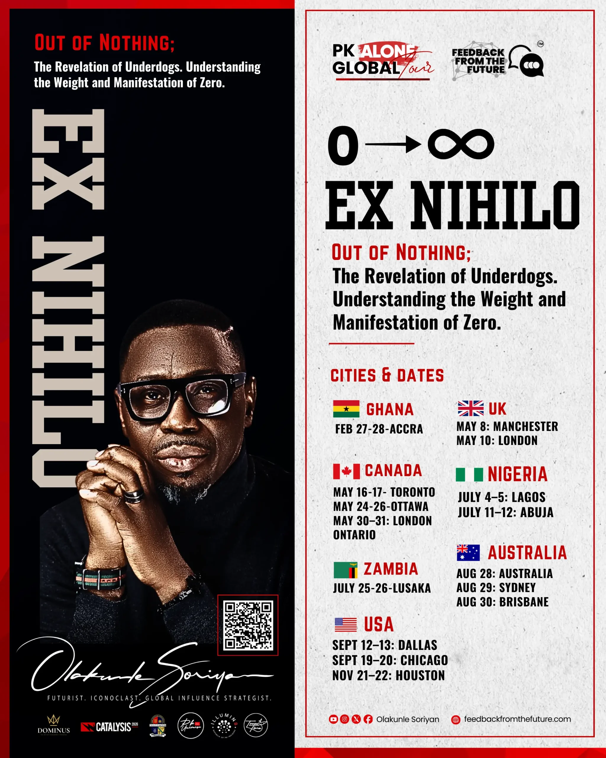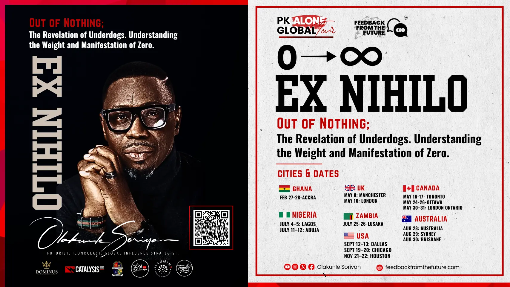 The tour will address, but not limited to, collapse as instruction, loss as data, silence as intelligence, and why most people misinterpret "nothingness and zero". The tour will also address translating emptiness into structure, turning obscurity into leverage, moving from internal alignment to external dominance, and responsibility as the engine of creation. It is a strategic re-coding.