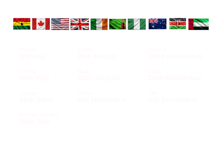 The journey begins on 3rd May in Ottawa, followed by Toronto on 19th May and Calgary on 28th June. It continues to Port Harcourt (PH) on 26th July, Lusaka on 2nd August, and Abuja on 30th August. In November, the tour reaches Ghana on 8th November, Houston on 22nd November and Lagos on 30th November. The tour concludes with UAE on 6th December.
